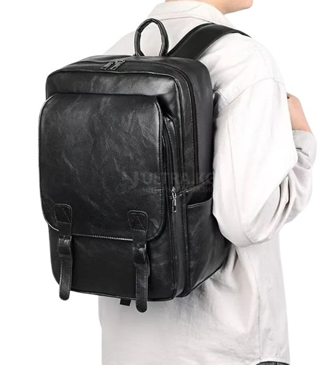 Городской кожаный рюкзак, большой размер, винтажный стиль, искусственная кожа, молнии, регулировка ручек, идеально для учебы , работы, до 15" ноутбука, Black Color - 07